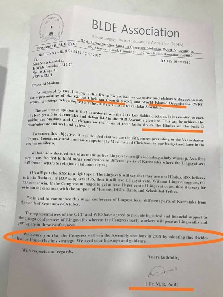 देश का एक प्रमुख राजनीतिक दल है, जिसके मुखिया के तार चर्च से जुड़ते हैं। यह आशंका इसलिए है क्योंकि आर्कबिशप की यह चिट्ठी ऐसे समय में आई है, जब प्रधानमंत्री नरेन्द्र मोदी को रोकने के लिए अनेक प्रकार के प्रयास चल रहे हैं। भाजपा विरोधी राजनेता यह जानते हैं कि प्रधानमंत्री मोदी के विजयी रथ को थामने के लिए हिंदू मत को विभाजित करना और बाकी के संप्रदायों के मत का ध्रुवीकरण करना आवश्यक है। कर्नाटक चुनाव के दौरान कांग्रेस सरकार के मंत्री डॉ. एमबी पाटिल का एक पत्र मीडिया के माध्यम से सामने आया। यह पत्र उन्होंने जुलाई, 2017 में कांग्रेस की तत्कालीन अध्यक्ष सोनिया गांधी को लिखा गया था। पत्र में डॉ. पाटिल ने स्पष्ट लिख है कि भाजपा को हराना है तो 'हिंदुओं को तोडऩा होगा।' साथ ही, ईसाइयों और मुसलमानों को धार्मिक भावनाओं के आधार पर एकजुट करना होगा। उन्होंने सोनिया गांधी को लिखा है कि हिंदुओं को बाँटने और ईसाई-मुस्लिम को अपने पक्ष में करने का प्रयास उन्होंने प्रारंभ कर दिया है। इसमें कर्नाटक कांग्रेस ने 'ग्लोबल क्रिश्चियन कॉउंसिल' और 'वर्ल्ड इस्लामिक आर्गेनाईजेशन' से मदद ली है। पाटिल ने लिखा है कि हिंदुओं को जाति (पिछड़ा वर्ग और अनुसूचित जाति-जनजाति) और धर्म में बाँट कर उसे कमजोर किया जा सकता है। कर्नाटक चुनाव में देश ने देखा भी कि किस प्रकार कांग्रेस ने हिंदुओं को जाति और धर्म (लिंगायत समुदाय को अलग धर्म की मान्यता) के आधार पर बाँट कर कमजोर करने का प्रयास किया। 'बाँटो ओर राज करो' की नीति का लाभ भी कांग्रेस को मिला है। संभव है कि चर्च की मदद से वह अपनी आगे की राह को सुगम करना चाहती है।